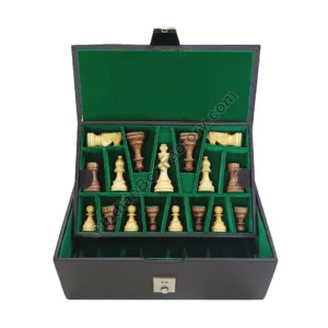 Store your Staunton chess pieces in style with our leatherette chess storage box. Designed for pieces measuring 3.8″ – 4″ tall, it features double trays with green felt lining, offering secure storage for up to 17 pieces per tray. The upper tray, with leatherette handles, is removable for easy access, while the lower tray remains fixed. To safeguard your luxurious set, it is fitted with a lock for security.